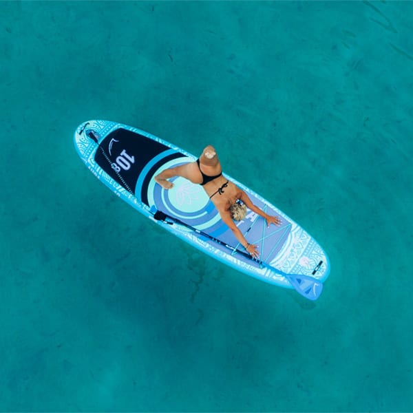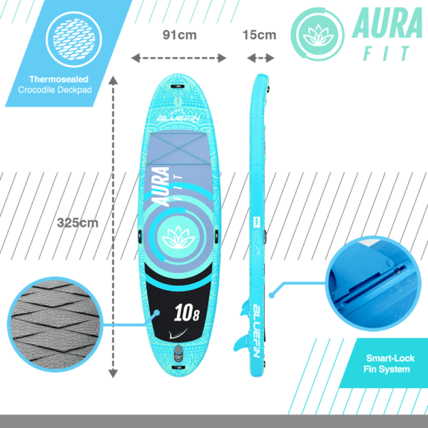 Het ruime activiteitendekpad van de Aura Fit biedt voldoende ruimte om lichaam en geest te verkennen. Met een brede allround vorm en gebogen neus en staart, is dit board ontworpen voor maximale stabiliteit tijdens fitness op het water. Het natuur-geïnspireerde centrale lotusbladdecor en het mandalapatroon maken dit board niet alleen functioneel, maar ook esthetisch aantrekkelijk.