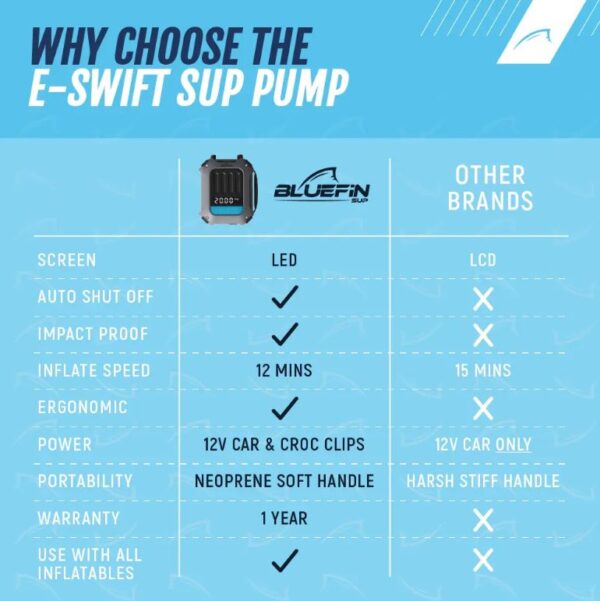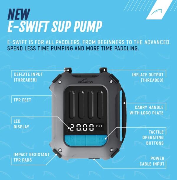 Laat de Bluefin E-Swift Elektrische Pomp je helpen om het oppompen van je supboard. Deze krachtige, draagbare elektrische pomp is ontworpen met jouw gemak in gedachten, zodat je meer tijd kunt besteden aan plezier en minder tijd aan het zwoegen met handmatig pompen.