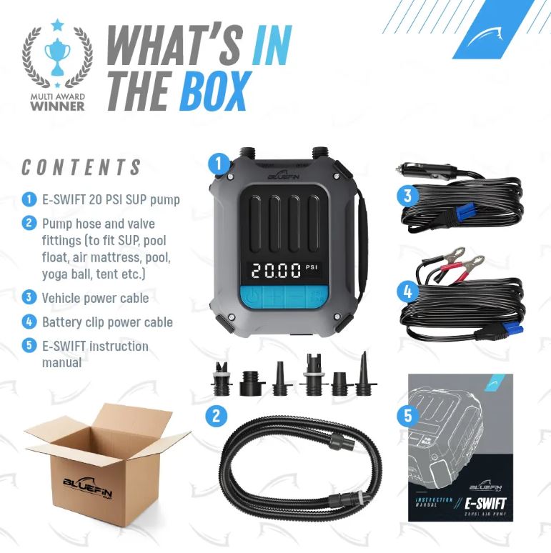 Laat de Bluefin E-Swift Elektrische Pomp je helpen om het oppompen van je supboard. Deze krachtige, draagbare elektrische pomp is ontworpen met jouw gemak in gedachten, zodat je meer tijd kunt besteden aan plezier en minder tijd aan het zwoegen met handmatig pompen.