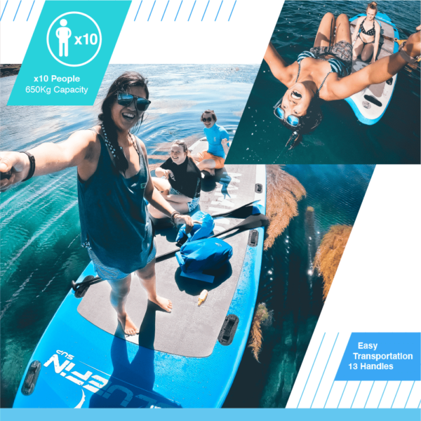De Bluefin MAMMOTH Inflatable SUP is het ultieme Standup Paddelbord om van te genieten met je vrienden. Met een enorme gewichtslimiet van 500 kg kan de MAMMOTH door maximaal 10 personen worden gebruikt voor een ongelooflijke groepservaring. Met een gewicht van 27 kg kan de MAMMOTH gemakkelijk in elk voertuig worden vervoerd, inclusief een handige draagtas en een hogedrukpomp. Grijp je vrienden en je peddels en geniet van de ultieme Paddle Boarding-ervaring.